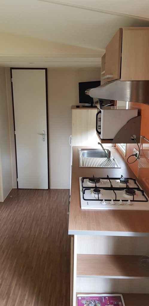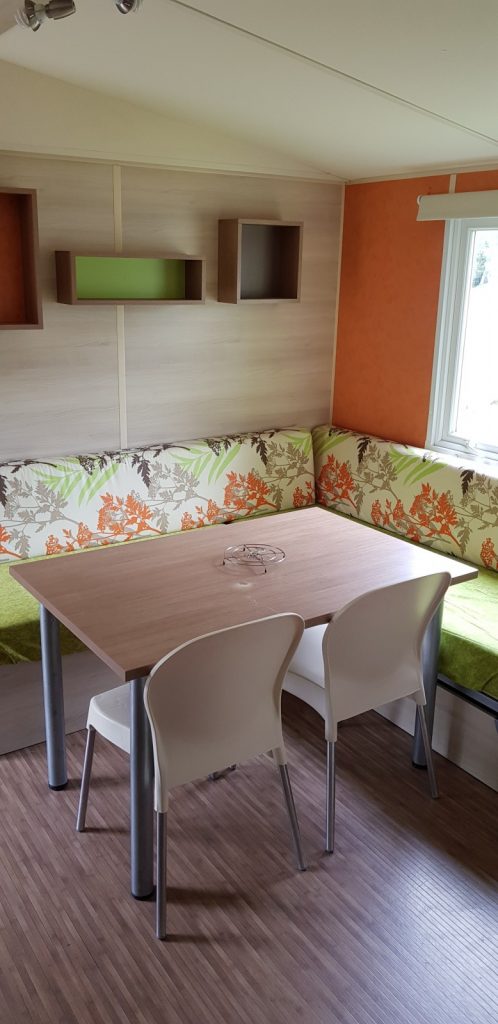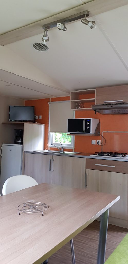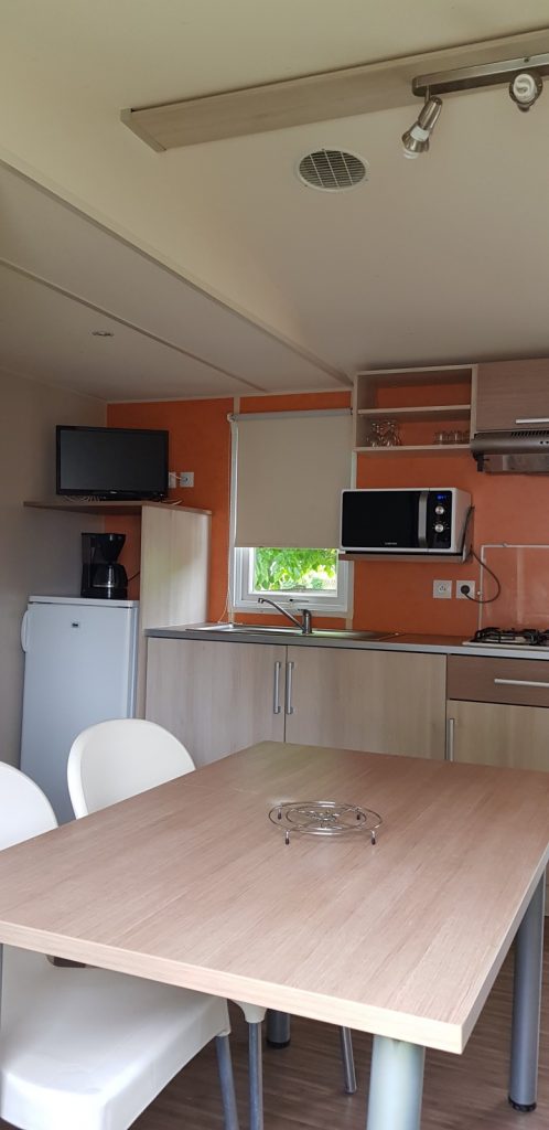 The mobile homes are composed of 2 bedrooms, a living room-kitchen equipped, a built-in terrace, and are offered for families of 4 people. Each mobile home has a private terrace and a vehicle pitch.
